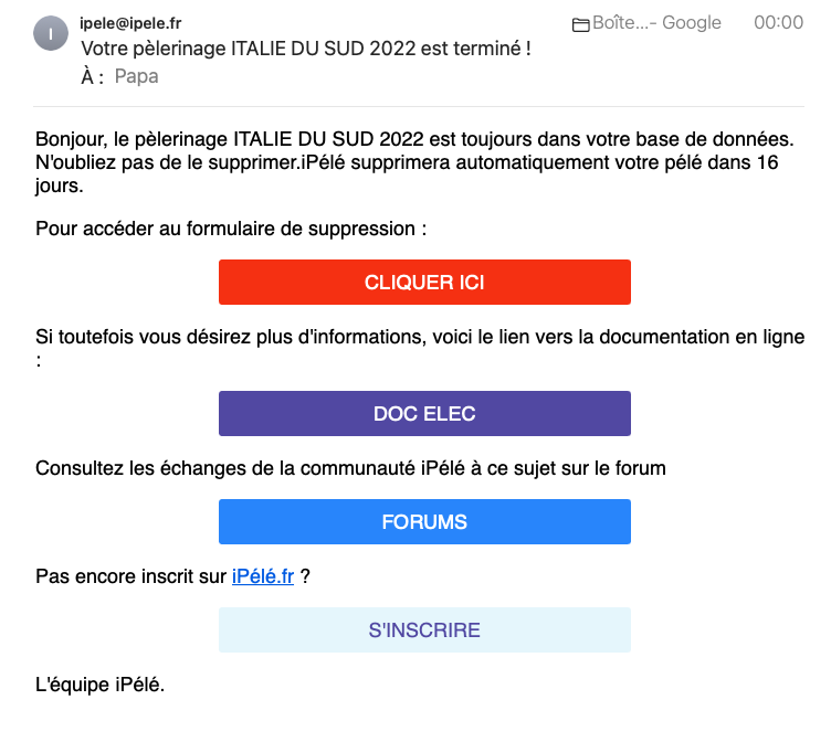 iPélé effacera l’ensemble des données relatives à ce pélé dans un délai de 30 jours. Durant ce délai, un mail de rappel est adressé à chaque organisateur, décrivant la procédure à suivre pour supprimer ce pélé de la base de données, et récupérer les données pertinentes si besoin. Gérer les données obsolètes est de la responsabilité de l’utilisateur et fait partie des bonnes partiques. La procédure est reprise pas à pas dans la rubrique « 5.2 – LES BONNES PRATIQUES ».